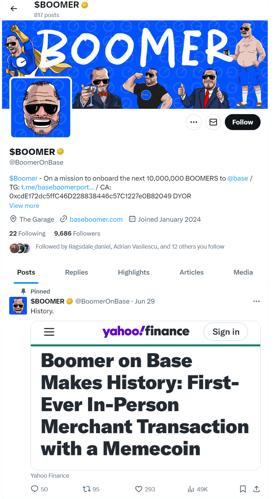 Boomer is a memecoin on the Base chain. It was launched on March 25, 2024. The memecoin is based on the “boomer” meme, which is quite popular and well-known.