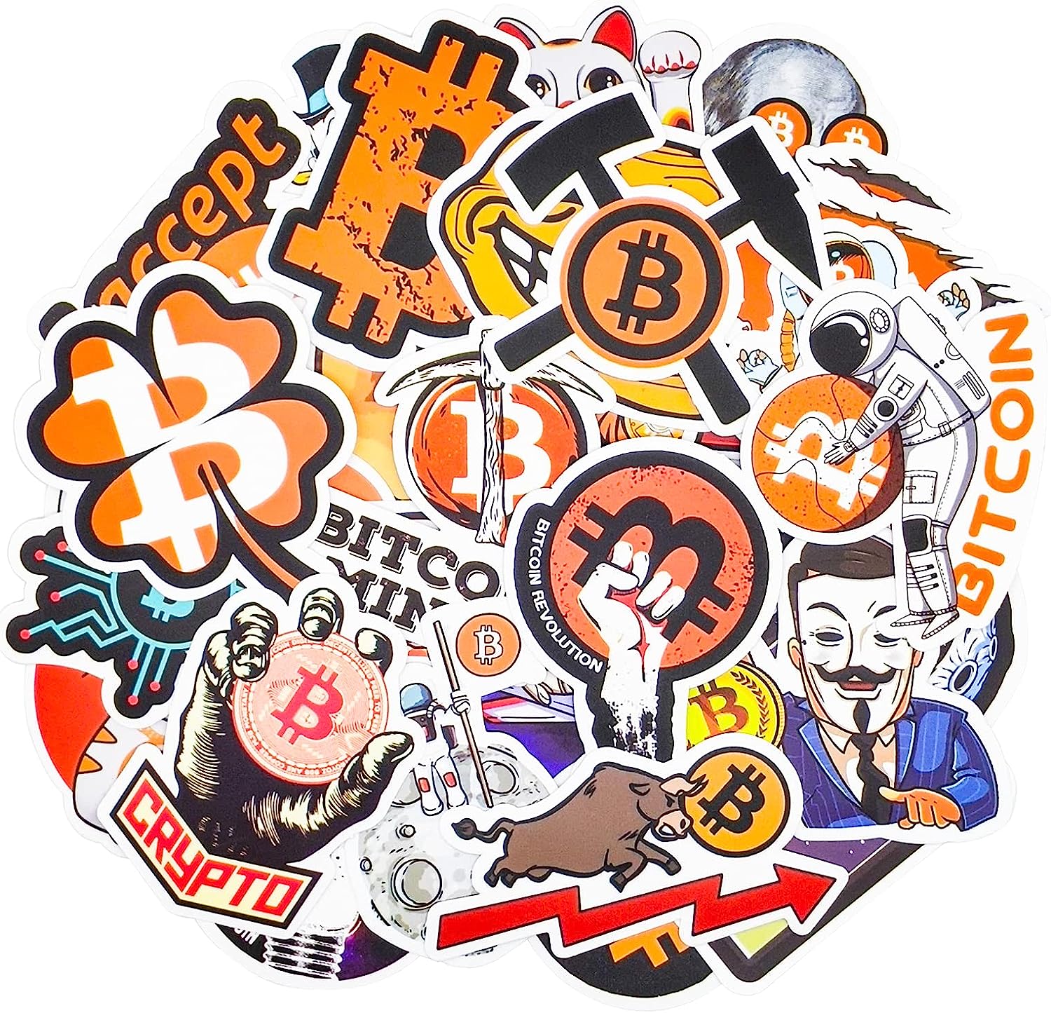 Product Description: Explore this fantastic offering – a collection of 50 unique Bitcoin crypto digital currency stickers, sized around 4 to 6 cm each, meticulously crafted for embellishing water bottles and laptops.